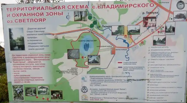 До Владимирского - ещё десяток километров по боковой дороге, и ныне и село, и Светлояр на слуху. Для наглядности переснял туристический стенд - хорошенько запомните не только расположение объектов, но и "рисунок" Светлояра, ближе к концу поста поймёте, для чего