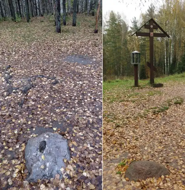 Рядом с храмом - целых два священных камня. Слева - Следовик, такие камни с отпечаток стопы Богородицы (а иногда и других святых) не такая уж редкость - я, например, один такой видел под Каргополем, а другой - в молдавской Сахарне. Справа же, по преданию, алтарный камень разрушенной Батыем древнерусской церкви; за ним - типичная местная пара креста и фонаря