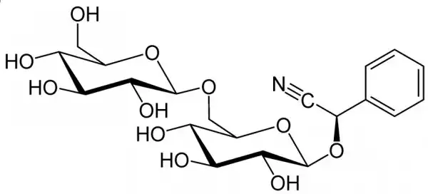 Амигдалин содержится в растениях семейства розоцветных (род слива — вишня, алыча, сакура, черешня, персик, абрикос, миндаль, черемуха, слива), а также в представителях семейств злаки, бобовые, адоксовые (род бузина), льновые (род лен), молочайные (род маниок). Содержание амигдалина в ягодах и фруктах зависит от множества различных факторов. Так, в семечках яблок его может быть от 1 до 4 мг/кг. В свежевыжатом яблочном соке — 0,01−0,04 мг/мл, а в пакетированном соке — 0,001−0,007 мл/мл. Для сравнения: абрикосовые косточки содержат 89−2170 мг/кг.