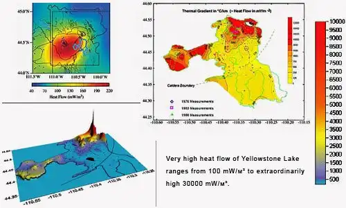 На схеме видно, что максимальная интенсивность теплового потока (более чем 10000 мВт/м²) приходится на северную часть озера, где идут активные вулканические процессы. Этот участок считается наиболее опасным, именно там может произойти гидротермальный взрыв.
