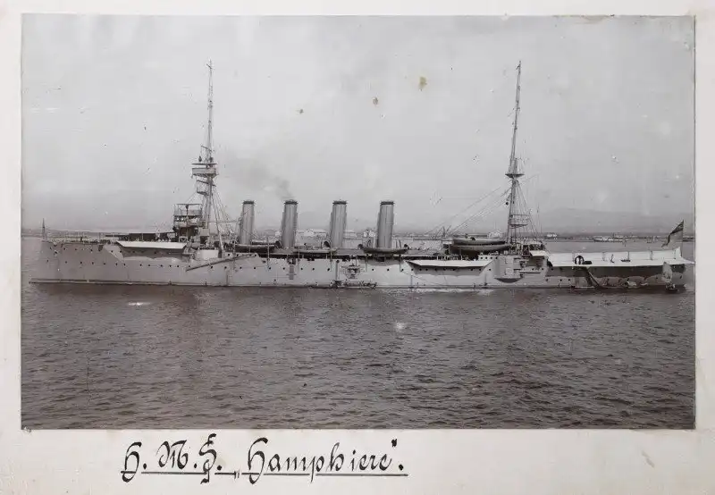 Броненосный крейсер «Хэмпшир» был одним из шести кораблей, построенных в 1904-1905 годах и получивших названия в честь английских графств («Антрим», «Карнавон», «Арджилл», «Девоншир», «Роксборо»). Водоизмещение - 10850 тонн, скорость - 22,3 узла, вооружение: четыре 190-миллиметровых орудия, шесть - 152-миллиметровых и двадцать одна - 47-миллиметровая пушки, два 457-миллиметровых торпедных аппарата, мощность паровых машин - 21500 лошадиных сил, экипаж - 655 человек.