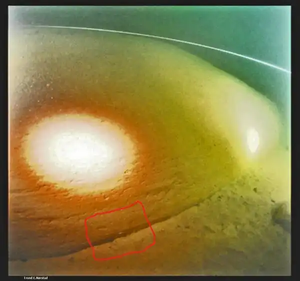 - Объект похож на шляпку гриба, - сообщил один из аквалангистов-исследователей Стефан Хогеборн. - Она поднимается над дном на 4 метра. Сверху в «грибе» - овальная дыра, вокруг нее - странные «подпалины»: образования, похожие на очаги, покрытые сажей.