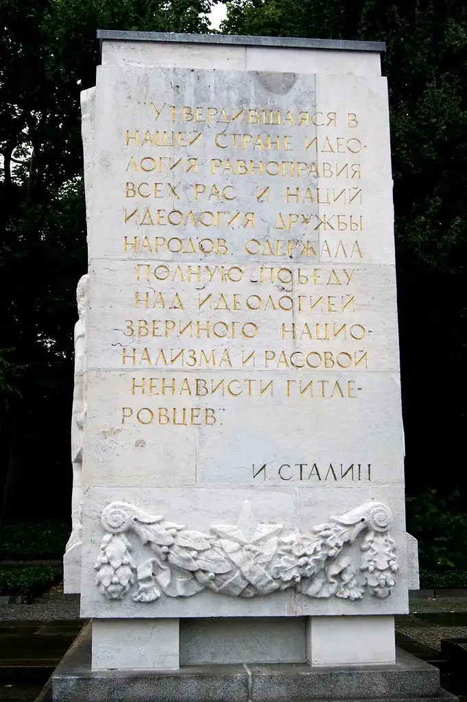 Вплоть до памятника слева и справа стоят памятные камни с барельефами описывающими подвиг Советского народа в борьбе с нацизмом и фашизмом, снабженные цитатами из речей Сталина посвященых Великой Отечественной войне, каждая цитата соответствует изображениям. Слева все камни с русским текстом, справа на немецком. Далее смотрим без комментариев и так все понятно.