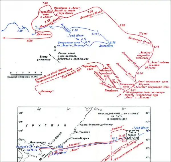 На кораблях обеих сторон стали подходить к концу боеприпасы, стреляли они медленнее и осторожнее, поэтому попаданий больше никто не добился. На «Аяксе» имелось 7 убитых и 5 раненых, на «Ахиллесе» – 4 убитых и 7 раненых. В 7:42 Хэрвуд поставил дымовую завесу, и под её прикрытием британские корабли описали зигзаг, чтобы резко увеличить расстояние до противника. Англичане постарались не выпускать немецкий корабль из вида, но при этом держаться от него на дистанции в полтораста кабельтовых, и в итоге «проводили» противника почти до самого Монтевидео.
