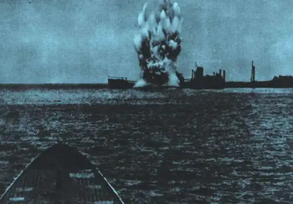 Почти сразу же после взрыва торпеды, а точнее по мощности взрыва, - торпед, старший помощник Л. Татаринов, второй механик Д. Трофимов, боцман Ф Штыков и матрос В. Архипов, находившиеся у носового орудия, сделали три выстрела по всплывшей в расстоянии полумили лодке. Однако ввиду большого дифферента и крена судна прицельного огня вести не удалось, тем не менее, после третьего выстрела лодка погрузилась и исчезла.