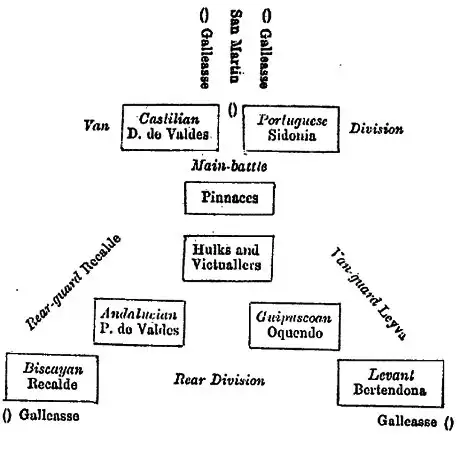 Никаких специальных построений для новых парусных флотов в это время англичанами разработано не было. В бой вступали по возможности, иногда мешая друг другу или перекрывая сектор обстрела. На дальних дистанциях разбивались на тройки, и, крутя восьмёрки, обстреливали испанцев. При этом, понятия о бортовом залпе ещё не было, то есть пушки стреляли по готовности, и чаще всего – куда бог пошлёт.