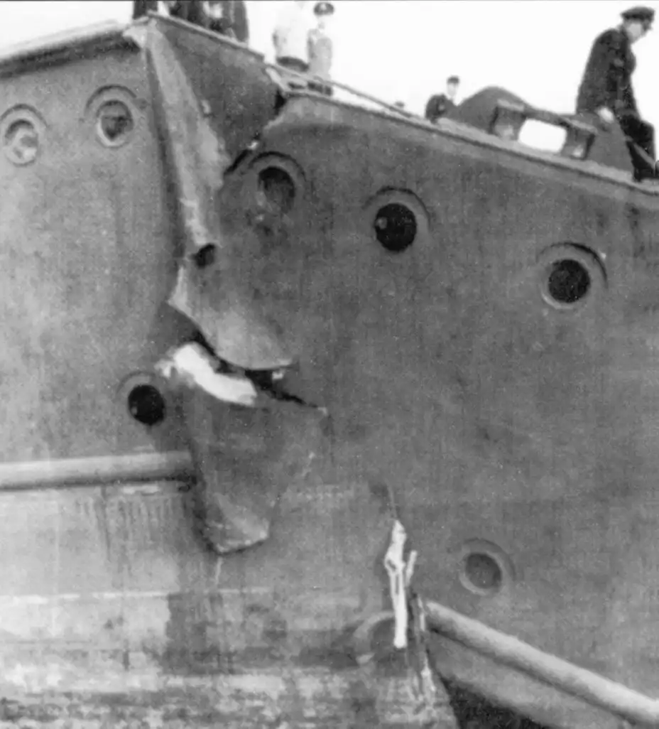 Повреждения «Ойгена» при попадании торпеды с подводной