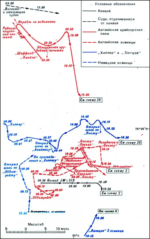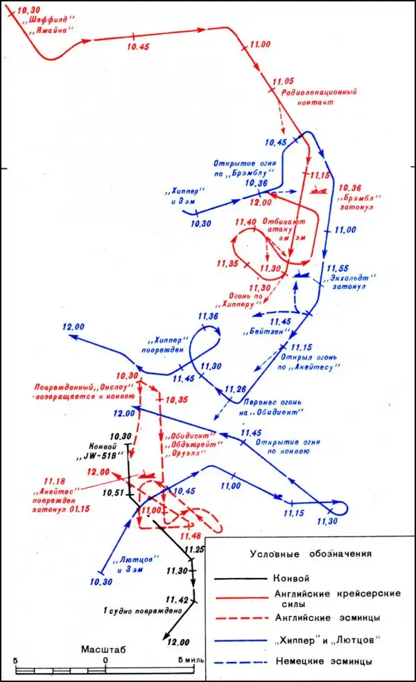 Однако британские эсминцы, охранявшие конвой, добились главного: пользуясь плохой видимостью и постоянно имитируя торпедные атаки, они превратили бой в беспорядочную свалку, отвлекли внимание немцев от конвоя и дождались подхода ближнего прикрытия – лёгких крейсеров «Шеффилд» и «Ямайка». «Лютцов» и «Хиппер» имели значительное преимущество в калибре и дальнобойности орудий, но по весу минутного залпа даже уступали противнику, а на коротких дистанциях боя преимущество крупного калибра снижалось. К тому же, немецкие корабли разделились, не видели друг друга, и «Лютцов» фактически не принимал участия в бою – то есть, «Хиппер» в одиночку оказался против двух крейсеров, пусть и лёгких, но современных и хорошо защищённых.