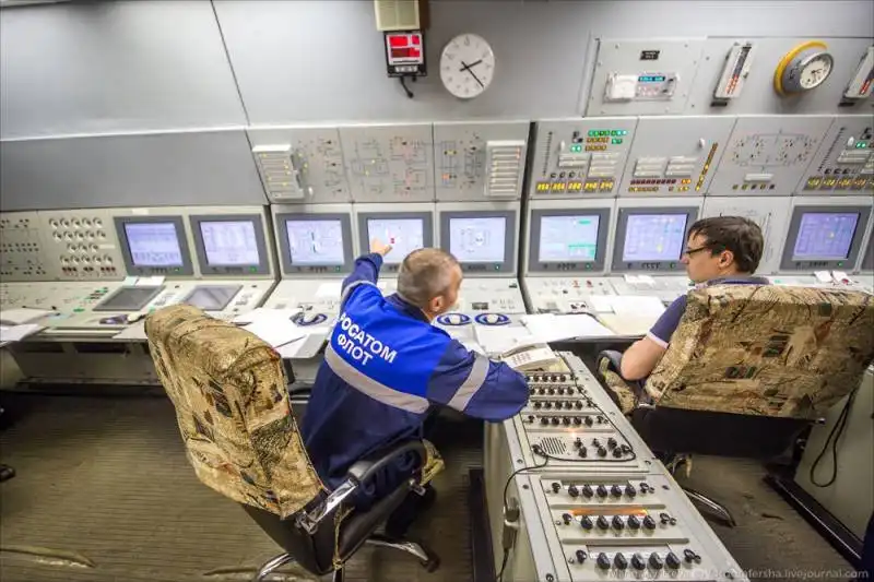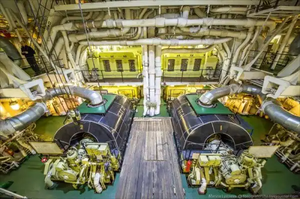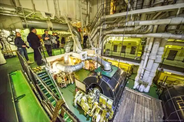 Атомный реактор нагревает «грязную» воду, та через теплообменник передаёт тепло «чистой» воде, она превращается в перегретый пар, который крутит турбины. Турбины крутят генераторы, которые вырабатывают электричество. И оно, помимо прочего, идёт на электродвигатели, которые крутят гребные винты. На судне стоят два атомных реактора, общая мощность силовой установки: 75 000 л.с.