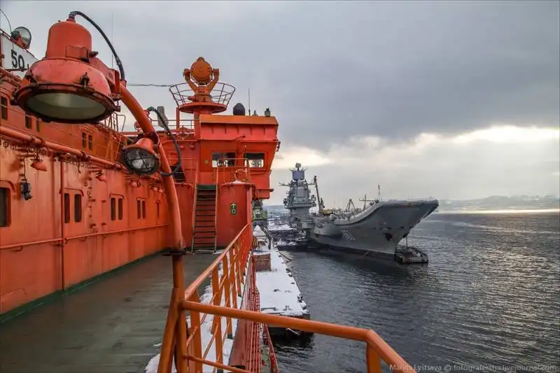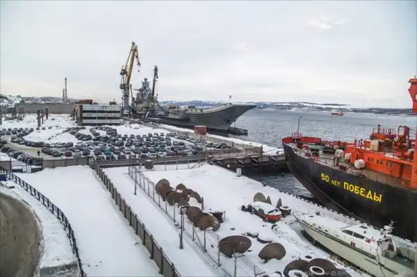 Базу "Росатомфлота" видно издалека: на фоне сопок словно выстроился арктический "конвой" из ледоколов, который защищает авианосец "Адмирал Кузнецов". Ну, здесь он с "гуманитарной миссией" - встал почистить перышки перед летней работой в Средиземном море.
