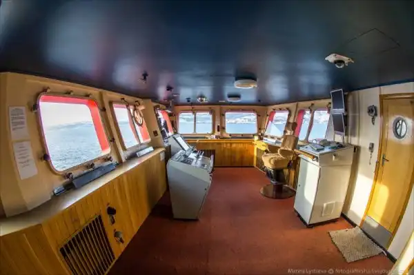 Когда ледокол идет в ночи, свет на мостике не включают, чтобы было видно, что происходит снаружи. Поэтому рабочее пространство отгораживается шторкой, чтобы свет лампы не мешал.