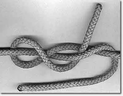 Его удобнее всего завязать, если сначала ходовой конец троса уложить в виде фигуры цифры 8 сверху коренного. После этого вытянутый ходовой конец второго троса продеть в петли, пропустить под среднее пересечение восьмерки и вывести над вторым пересечением первого троса. Далее ходовой конец второго троса нужно пропустить под коренной конец первого троса и ввести его в петлю восьмерки, как указывает стрелка. Когда узел затянут, два ходовых конца обоих тросов торчат в разные стороны. Кинжальный узел нетрудно развязать, если ослабить одну из крайних петель.