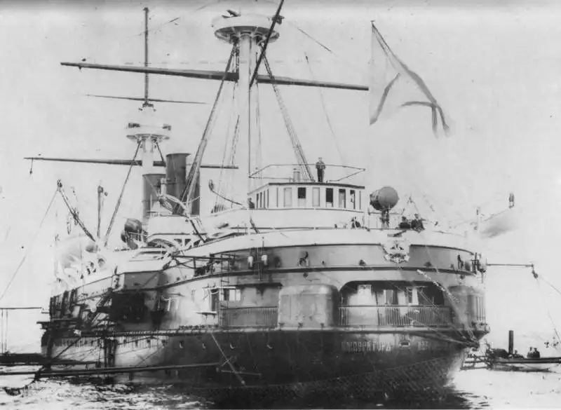 1 июля 1887 года состоялся спуск корабля на воду, после чего началась погрузка машин и котлов. В октябре завершилась сборка броневой палубы, начался монтаж батарейной и верхней палуб, изготовление и установка деревянных бортовых щитов, каютных переборок, дверей. Покрытие палуб деревом закончилось лишь в апреле 1888 года. Заказанные Металлическому заводу барбетная установка, семь бортовых торпедных аппаратов (от двух в районе кормы впоследствии отказались), а также последние 29 бортовых плит установили из-за задержки поставок только к концу 1889 году. Переданный на достройку в Кронштадтский порт весной 1890 года броненосец начали готовить к испытаниям, несмотря на массу недоработок. В специально созданную приемочную комиссию под председательством адмирала К.П. Пилкина входил младший флагман Балтийского флота контр-адмирал С.О. Макаров. Прошедшие 18 сентября 1890 года испытания механизмов показали хорошие результаты, хотя обе машины в сумме не добрали 211 л.с. (при водоизмещении 8748 т и мощности 8289 л.с. скорость составила 15,27 уз).