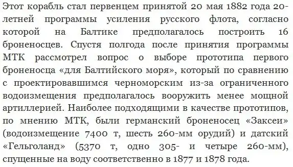 Интересно отметить отношение строителя броненосца подполковника Н.А. Субботина к начинавшейся в Морском министерстве кампании по «экономии» средств при постройке кораблей. Предлагая заказать в Англии весьма дорогостоящие тиковые брусья, он писал, что броненосцы строятся для долговечной службы, и строитель обязан все конструктивные элементы, до самых мелких, делать "из материалов наилучшим образом... меньший ремонт гораздо более сделает сбережений для казны впоследствии, чем временная экономия от удешевления материала при постройке». Весь 1884 года ушел на строительство корпуса; замедлившиеся в зимний период работы с новой силой возобновились весной. Для корпуса, доведенного в апреле до жилой (броневой) палубы, оба штевня и рулевую раму заказали Путиловскому заводу, а Ижорскому — плиты вертикальной брони и листы из мягкой стали для бронирования палубы. Балтийский завод начал изготовление главных механизмов.
