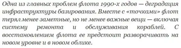 Обвальное сокращение военных расходов в 1990-е годы среди прочего повлекло за собой падение промышленности, которая сжималась, сокращая затраты. Первыми жертвами этого сжатия становились внешние подразделения — в том числе те, что отвечали за ремонт кораблей и судов в пунктах базирования. Это, в свою очередь, резко сокращало уже боевые возможности ВМФ — выход агрегатов из строя надолго лишал соединение рабочей «единицы», отправлявшейся на завод.