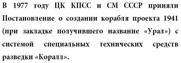 В 1977 году ЦК КПСС и СМ СССР приняли Постановление о создании корабля проекта 1941 (при закладке получившего название «Урал”) с системой специальных технических средств разведки «Коралл”. Подготовку и согласование проекта постановления с многочисленными министерствами и ведомствами обеспечила группа сотрудников 10-го ГУ Минрадиопрома и Ленинградского филиала ГПТП под руководством В.Курышева, занимавшего в то время должность заместителя начальника главка.