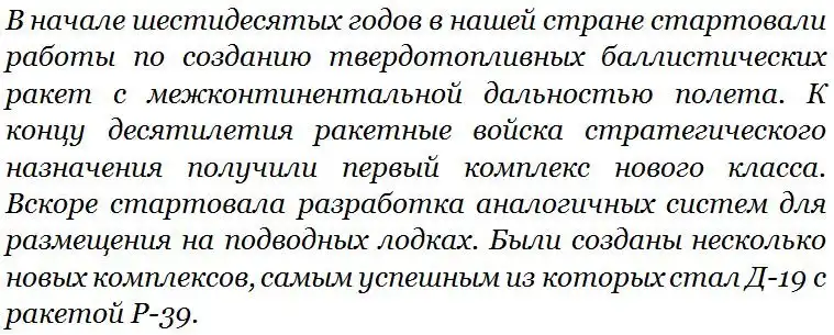Решение о разработке новой ракеты было принято в середине 1971 года. СКБ-385 / КБ машиностроения, возглавляемому В.П. Макеевым, поручили создать новый ракетный комплекс для подводных лодок. Следовало создать трехступенчатую твердотопливную ракету со стартовым весом около 75 т длиной до 15 м. Изделие должно было нести моноблочную или разделяющуюся головную часть (3-5 или 8-10 боезарядов) и доставлять боевые блоки на расстояние до 10 тыс. км. Проект нового ракетного комплекса получил обозначение Д-19 и шифр «Тайфун». Ракету обозначили как Р-39.