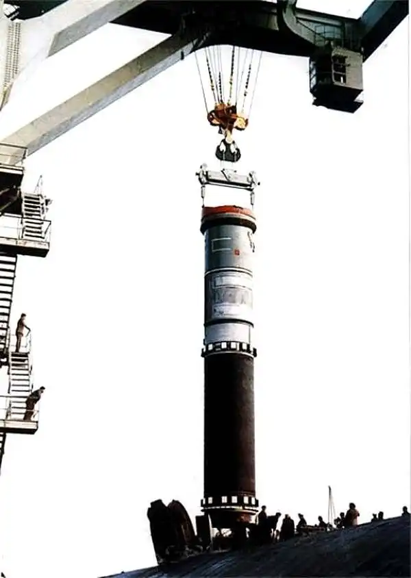 Загрузка ракеты Р-39 на подводный крейсер типа "Акула"