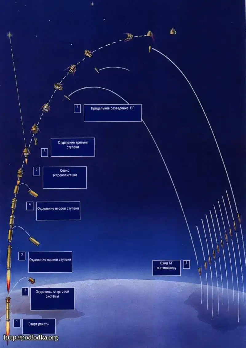 Крепления для боевых блоков располагались на корпусе третьей ступени, рядом с агрегатами ступени разведения. После 1975 года велась разработка только одной головной части, несущей десять боевых блоков мощностью по 100 кт. От внешних воздействий боезаряды и аппаратура защищались сбрасываемым в полете обтекателем, образованным несколькими коническими поверхностями.