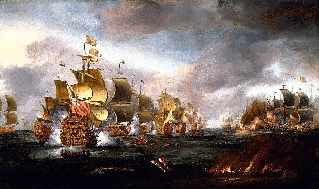 28 июля, наконец, последовало долгожданное объявление войны между двумя странами. Первая англо-голландская война длилась почти два года. Боевые действия происходили не только в водах Северного и Средиземного морей, но и в отдаленных колониальных регионах. Поначалу успех сопутствовал голландцам, однако в 1653 г. их флот потерпел два серьезных поражения. 12–13 июня Тромп был разбит «морским генералом» Джорджем Монком у банки Габбард. Во время сражения англичане в отличие от голландцев старались держаться четкой кильватерной колонной, хотя выходило это не у всех. Их противники сражались по старинке. Итогом была потеря 6 и захват 11 голландских кораблей при весьма несущественных потерях в людях у англичан. 10 августа того же года последовал в целом не удачный бой у Схевенингена, где Мартен Тромп был сражен пулей с английского корабля. Морская торговля несла колоссальные убытки: с начала войны голландцы лишились почти 1600 торговых судов, катастрофически снизился ввоз рыбы. Голландские купцы уже намозолили себе пальцы о костяшки счетов вычислительными операциями по изучению убытков, и они готовы были мириться. Черт с ним, с этим Навигационным актом и правом салюта, зато бизнес не рухнет. 8 мая 1654 г. между двумя странами подписывается Вестминстерский мир, согласно которому Нидерланды признавали Навигационный акт.