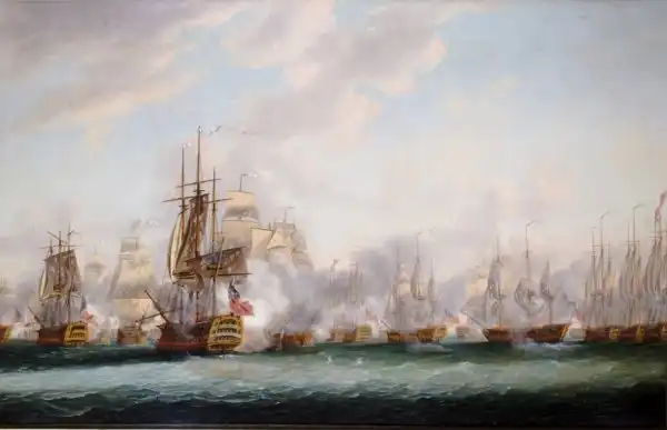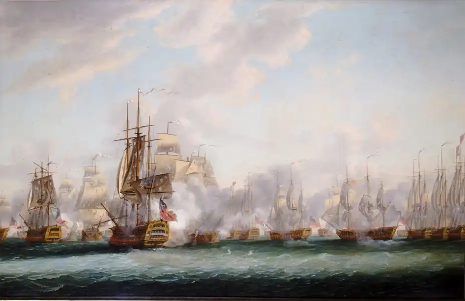И, тем не менее, эта тактика была применена в сражении у островов Всех Святых (1782) адмиралом Джорджем Роднеем. Одержанная им победа подсластила пилюлю от невыразительного выступления Роял Неви в войне за независимость США. Родней поймал флот французов в ловушку у Доминики, прижав к берегу. Поскольку французы выстроили свою знаменитую линию и бой шёл на контр-курсах, скорее всего, закончился бы он ничьей, как и при Уэссане. Но тут счастье улыбнулось Роднею: ветер вдруг изменился с восточного на юго-юго-восточный. Те французские корабли, которые уже шли в голове колонны на SSW, остались на прежнем курсе, но остальные – в центре и арьергарде — встретили лобовой ветер. Чтобы продолжить движение, им пришлось повернуть нос к западу, что подставило их под губительный продольный огонь противника. А главное – в их линии появились разрывы.