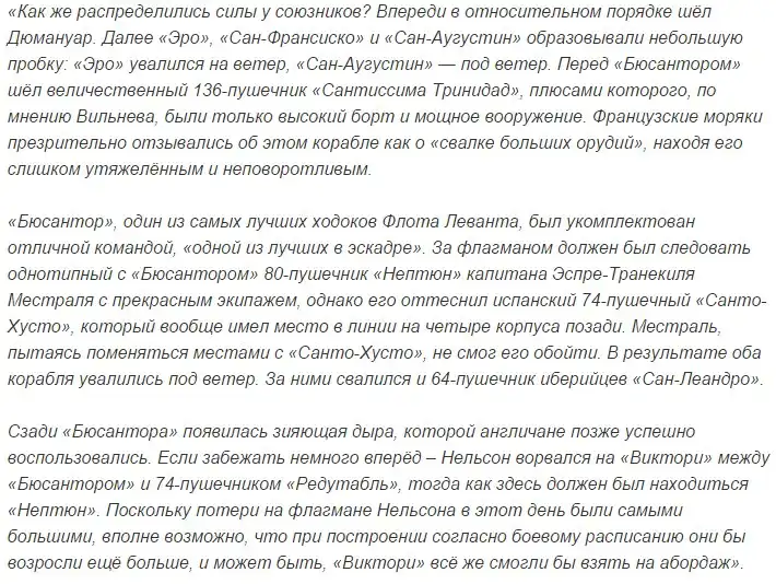 При Трафальгаре франко-испанскому флоту просто не удалось держать линию, где бушприт одного корабля ложился бы на корму другого: