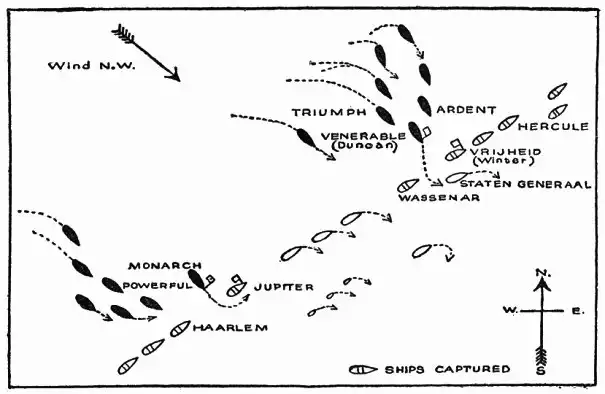 Заметим, что манёвр по прорезанию линии стал возможным только из-за того, что в некоторых местах огневая мощь голландцев была ослаблена поставленными в линию с кораблями фрегатами. В ином случае головные корабли Дункана понесли бы большие потери, и, скорее всего, никакого прорезания не состоялось бы.