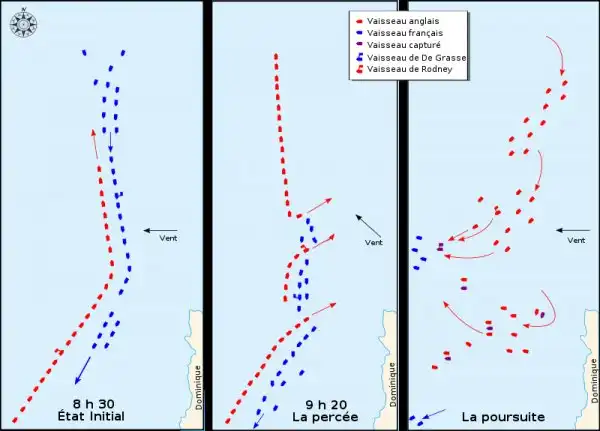 Родней прорезал линию де Грасса между 74-пушечными «Глорье» и «Диадем». Британский трёхдечник обрушил продольные залпы на оба французских корабля, следующие за ним пять кораблей также вели огонь по противнику. Родней обогнул «Диадем» и открыл по французам огонь левым бортом. Корабли французского арьергарда скучились, задние, пытаясь отвернуть, налезали на передних. В итоге корабли Водрёя перестали представлять боевую силу.