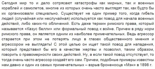 Однако, если все-таки это была не просто катастрофа, то кто был ее организатором? Конечно, не испанцы, у них с флотом дела были еще хуже. Случайность также не исключается, поскольку военный корабль набит взрывоопасными предметами, а дураки, что курят возле бочки с порохом, встречаются везде. И, тем не менее, оперативность реакции прессы на взрыв и неистовый ее характер, прямо указывают на то, что этот взрыв не был случайностью, ну а уж потом очень умело использовали его результаты. Вполне возможно, что к нему могут быть причастны и так называемые «ультра» и даже Ку-клукс-клан, чьи интересы были связаны с крупным бизнесом, хотя сами «клановцы», разумеется, этого никогда не афишировали. Ряд историков США в своё время высказывали мысль, что это могли быть те люди, что опасались мирного урегулирования давно уже назревавшего конфликта и действовавшие на свой страх и риск помимо правительства, и те, кто был кровно заинтересован в захвате богатств и Кубы и Филиппин. Могло быть, что кто-то в США ввязался в эту игру помимо президента? Да, могло! Ну, а он лишь использовал предоставленный ему «историей» шанс. Во всяком случае, времени с момента тех событий сейчас уже прошло так много, что истины мы не узнаем уже никогда. Однако и сегодня мы видим тот же почерк: хорошую режиссуру и странные последствия имевших место драматических событий, и это не может не настораживать, так как история имеет особенность повторяться!