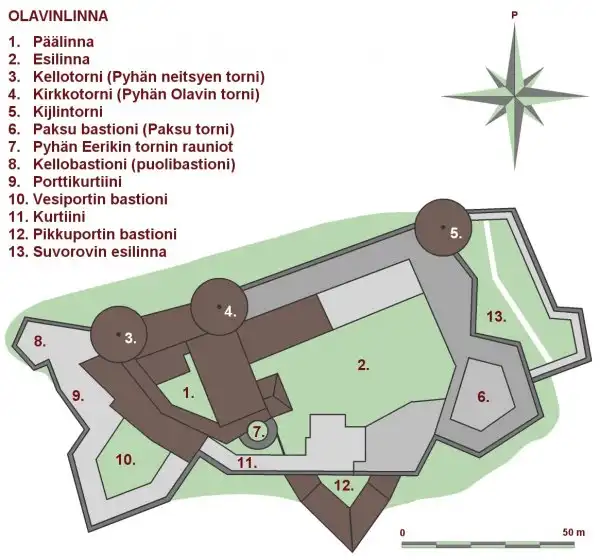 Первоначально крепость Олавинлинна имела 3 башни, которые соединялись между собой довольно высокими стенами. На первом этаже восточной башни находилась церковь. Южная башня была разрушена во время Северной войны. Немного позднее была сооружена стена с двумя круглыми башнями, связанные между собой куртинами. У крепости был единственный вход. Он проходил по деревянному мосту, который легко отсоединялся в случае опасности.