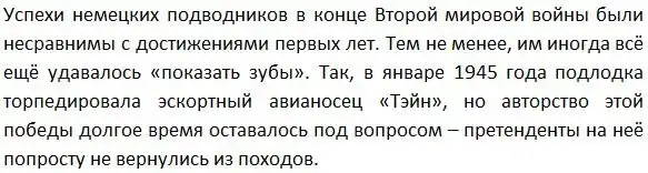 Если теперь вернуться к событиям 15 января 1945 года, вполне уместно возникнет вопрос: кто же торпедировал авианосец и танкер? Если U 482 к тому моменту уже лежала на дне Атлантики, то обе атаки могла совершить только другая субмарина.
