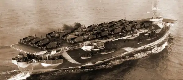 «Тэйн» выходит в море с палубой, заставленной «Хеллкэтами».