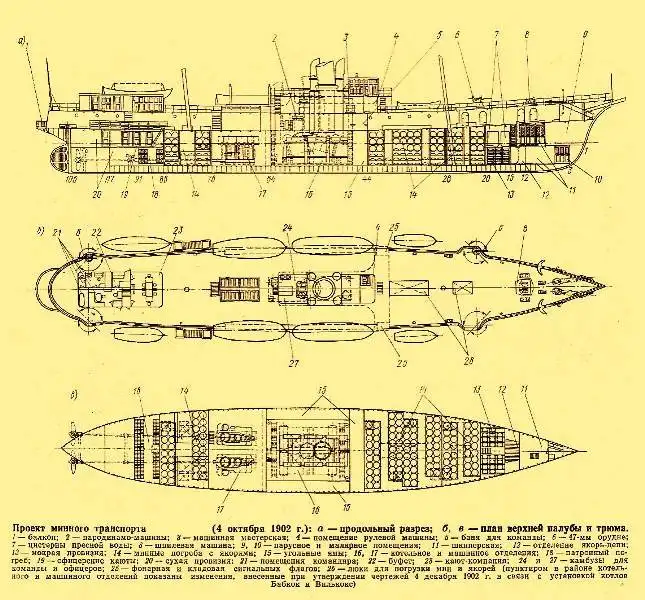 Основные требования к конструкции корабля (с учетом изменений, вносимых в чертежи транспорта «Буг») сводились к следующему: водоизмещение 1300 т признавалось достаточным для размещения 400 шаровых мин с якорями образца 1898 года (общая масса 200 т). Для удобства податочные рельсы спрямлялись, для чего требовалось уменьшить седловатость верхней палубы. Чтобы сохранить мореходные качества, увеличивался развал носовых шпангоутов в надводной части; кормовому образованию придавалась обычная (прямая) форма, так как кормовой подзор создавал трудности при минных постановках; предусматривался балкон со съемными поручнями для удобства при работе с минами, «как это делается на французских крейсерах...» При двухвальной механической установке и наибольшей скорости в 13 уз считались обязательными водотрубные котлы Бельвиля; в состав парусного вооружения включались два триседя и кливер, а в артиллерийское - четыре 47-мм скорострельных орудия. Детальные изменения касались в основном следующего: решили сделать стальной жилую палубу, увеличить расстояния между стеллажами для большего простора в минных погребах, офицерские помещения вынести по возможности на верхнюю палубу, в кормовой части установить механические счетчики оборотов, в машинном отделении - счетчики Валеси, у лацпортов - телеграф и переговорную трубу, на мостик и в машинное отделение. Улучшались пожарная, водоотливная, а также система затопления погребов. В мирное время транспорт предполагалось использовать для маячной и лоцманской службы на Балтике, поэтому предусматривалось размещение четырех котлов «Пинча» с нефтяным газом для заправки бакенов. Особое внимание обращалось на улучшение остойчивости по сравнению с «Бугом», отличавшимся значительной валкостью.