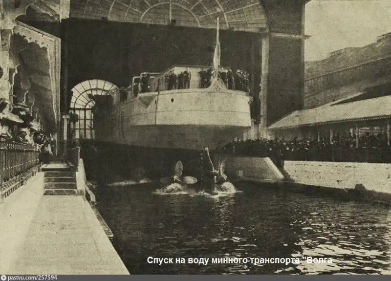 Затянувшееся на полгода согласование чертежей паровых машин привело к временному прекращению работ по корпусу и срыву первоначального срока спуска транспорта на воду, кроме того, Путиловскому заводу пришлось изготавливать заново забракованные кронштейны гребных валов. Таким образом, к погрузке котлов, также сделанных с опозданием, приступили только в марте 1904 года, а 22 июля они прошли гидравлические испытания. После освидетельствования спускового устройства, одновременно с закладкой канонерской лодки «Хивинец», 28 августа спустили на воду и минный транспорт «Волга». Внесенные в ходе постройки изменения (увеличение массы механизмов до 266,9 т, уменьшение числа мин до 312 и т. д.) привели к перераспределению нагрузок и вызвали опасения за остойчивость корабля. Это, а также недостаточные скорость и дальность плавания, вынудили МТК отклонить предложение о посылке транспорта на Дальний Восток во время русско-японской войны.