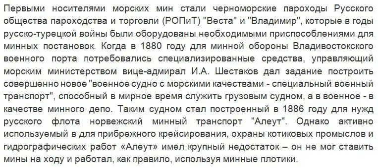 В 1889 году лейтенант В.А. Степанов предложил снабдить корабль низкорасположенной закрытой минной палубой, над которой по всей длине проложить Т-образный рельс, предназначенный для транспортировки и сброса за борт корабля мин на необходимом по требованиям безопасности расстоянии. Эта система позволяла производить постановку мин на скорости хода до 10 узлов через равные промежутки. Изобретение Степанова открыло дорогу к созданию специального минного заградителя, и в том же году Морское министерство объявило конкурс на проектирование и постройку двух таких кораблей для Черноморского флота. По итогам конкурса лучшим был признан проект шведской фирмы "Мотала" - она-то и получила заказ на постройку минных транспортов "Буг" и "Дунай". В 1892 году они вступили в строй, став первыми транспортами, способными производить скрытную постановку мин на ходу.