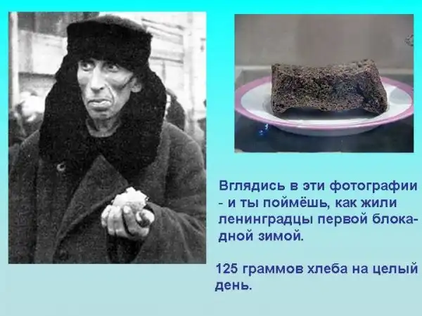 Придите сегодня домой, отрежьте даже эти 250 "рабочих" грамм чёрного хлеба и представьте, что только этот кусочек будет вашей едой каждый день. И всё! Ни колбасы, ни сыра, ни макарон, даже картошки не будет. И при этом вам надо ходить каждый день на работу - на завод, ремонтировать танки по 10-12 часов, потом идти обратно домой, искать дрова для буржуйки, кормить чем-то детей, престарелых родителей, таскать воду в вёдрах и бидонах по нескольку километров по заснеженным улицам. А утром часов в 6 в мороз до 20 градусов опять несколько километров до завода. И при этом верить в Победу. Вы сможете?