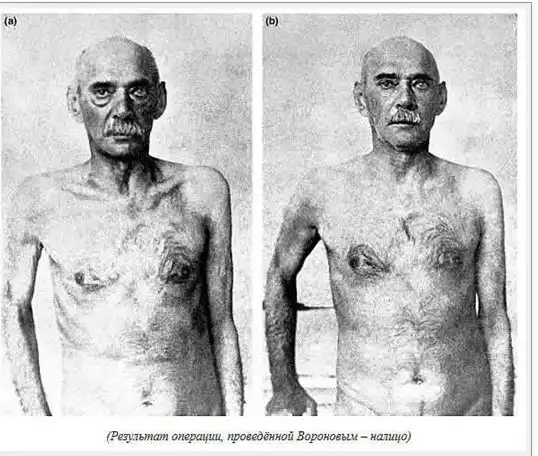 Воронову оставалось лишь воспользоваться научными открытиями своих современников, соединив их с блестящим владением практической хирургией. В 1920 году доктор Воронов провел первую операцию на человеке, вживив ему щитовидную железу обезьяны, а потом перешел и на пересадку половых желез. С технической точки зрения операции проходили так: хирург не заменял один орган другим, а добавлял к человеческим яичкам тонкую «нарезку» препарата, приживавшегося (как тогда считалось) в организме реципиента и начинавшего вырабатывать половые гормоны. Скорее, это можно было назвать «прививкой» обезьяньей энергии.