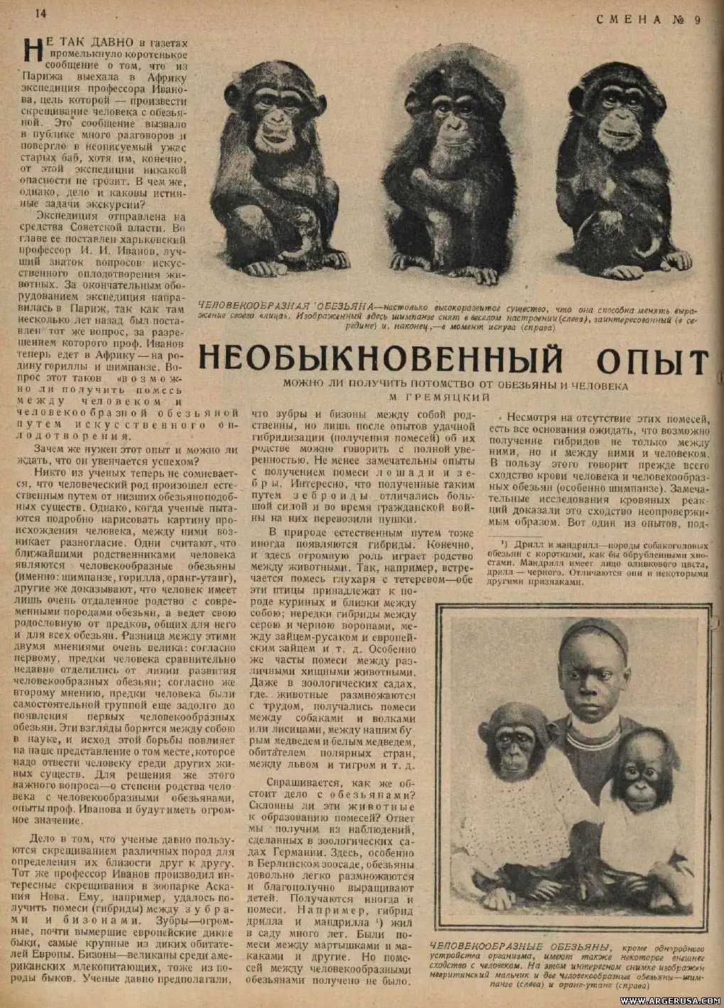 Именно опыты Ильи Иванова и стали беллетристикой в СССР, обрастая с каждым годом домыслами. Иванов якобы выводил «гибридного человека» – получеловека-полуобезьяну.