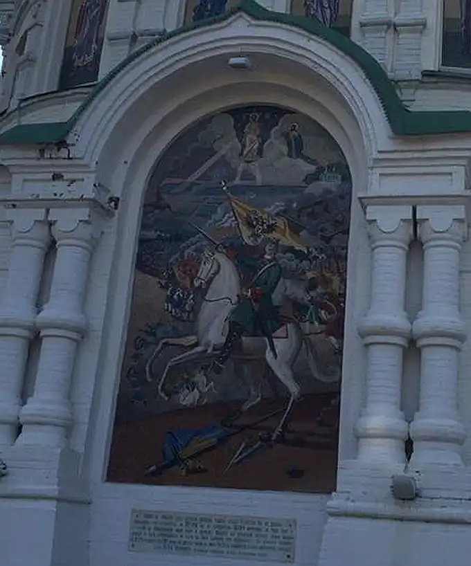 На что советнику-двоечнику многие блогеры сказали, что он может не обижаться, так как храм этот - часть мемориала Полтавской битвы 1709 года, в которой Петр I разгромил шведов. И это именно их флаг топчет конь русского царя. То, что шведский флаг той же расцветки (голубой и желтый), что и нынешний флаг Украины - художник не виноват. Да и Петр I тоже.