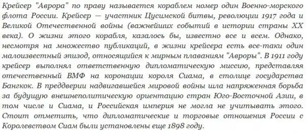 С постановкой на якорь на "Аврору" прибыли российский посланник и младший сын сиамского принца, они поздравили великого князя и экипаж с благополучным прибытием. К сожалению, как вспоминал Г.К. Старк, наш посланник оказался далеко не в курсе того, как будет проходить церемония коронации и кто на ней должен официально присутствовать. Естественно, все это вызвало неудовольствие великого князя. Было решено, что на торжества отправятся великий князь со свитой и два офицера корабля, в том числе и командир "Авроры". Около половины двенадцатого на сиамской яхте они убыли в Бангкок, и на корабле наступило затишье.