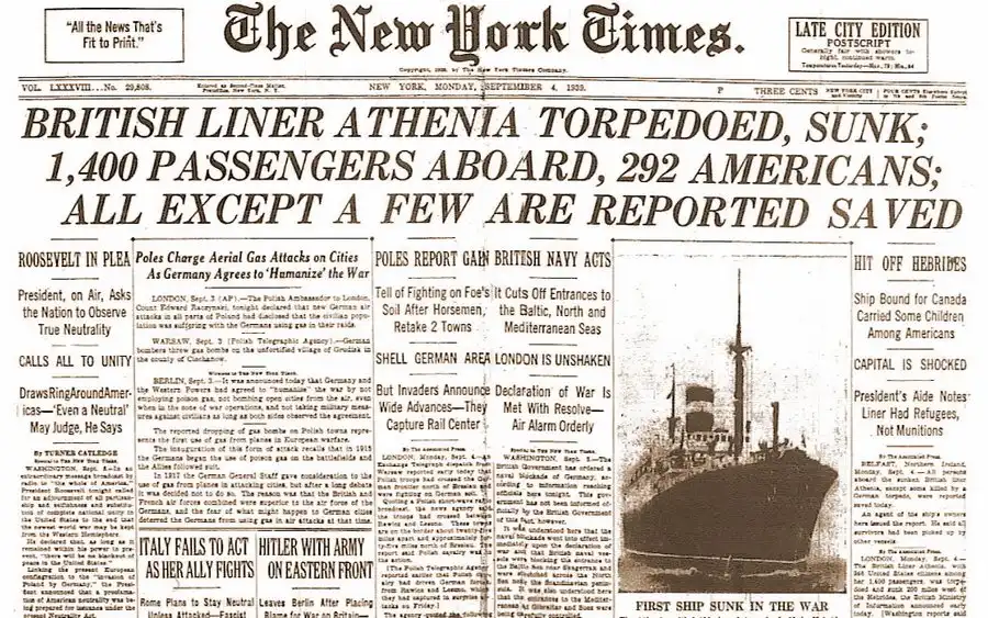 Как известно, первым судном, потопленным подводной лодкой во Второй мировой, стал британский лайнер «Атения» (SS Athenia), пущенный на дно немецкой U 30 обер-лейтенанта цур зее Фрица-Юлиуса Лемпа (Fritz-Julius Lemp) спустя несколько часов после объявления Великобританией войны Германии. Сейчас уже хорошо известно, что Лемп торпедировал «Атению» по ошибке, но своими действиями он подложил большую свинью руководству кригсмарине и Рейха. Гибель на лайнере граждан нейтральных государств, включая США, позволили англичанам обвинить немцев в нарушении правил ведения войны на море, и газеты всего мира, как и 20 лет тому назад, взорвались заголовками о немецких подводных пиратах.