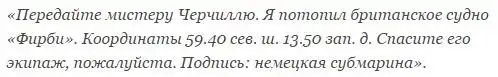 Стоит отметить один прелюбопытный факт. Как оказалось, Герберт Шульце бросил прямой вызов самому Уинстону Черчиллю. В том же походе спустя неделю U 48 потопила британский пароход «Фирби» (Firby), после чего Шульце позволил себе необычайную выходку. Он отправил открытым текстом радиограмму следующего содержания: