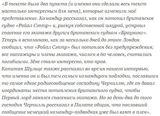Если переложить эту ситуацию на язык рыбаков и современного интернета, то немецкий командир в буквальном смысле «троллил» Первого морского лорда Великобритании. Как отреагировал Черчилль на это, становится ясно из интервью, которое американский журналист Уильям Ширер взял у Шульце 29 сентября 1939 года, после возвращения последнего из того самого похода, когда были потоплены «Ройал Сэптр» и «Фирби». Ширер писал: