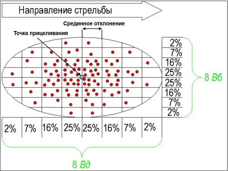 Область, в которую падают снаряды, называется эллипсом рассеивания. Центр эллипса и есть та точка прицеливания, куда была наведена пушка. И у этого эллипса рассеивания есть свои законы.