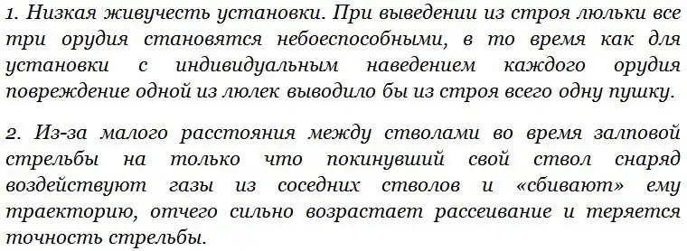 Впрочем, у «однолюлечных» установок были и свои достоинства. Размещение орудий по разным люлькам столкнулось с проблемой рассогласования осей орудий: это ситуация, когда орудиям в башне выставлен один и тот же прицел, но из-за рассогласования положения индивидуальных люлек они имеют чуть-чуть разные углы возвышения и как следствие — повышенный разброс в залпе. И, разумеется, «однолюлечные» башенные установки сильно выигрывали по массогабаритным характеристикам.