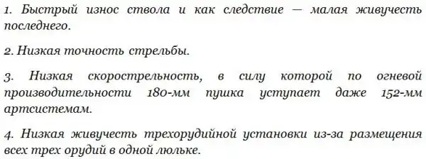 Таким образом, одни авторы восхищаются мощностью и рекордной дальностью советского орудия, в то время как другие (критики, каких большинство) указывают на следующие ее недостатки: