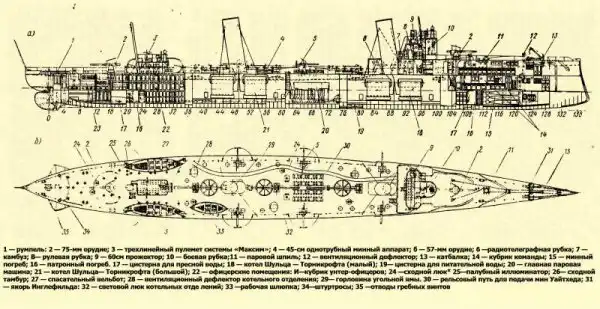 В четырех котельных отделениях располагались два малых (носовых) и два больших (кормовых) котла системы Шульца-Торникрофта, с рабочим давлением 16 атм. Нормальный запас угля составлял 140 т, усиленный — 172 т. Контрактная мощность двух главных паровых машин тройного расширения определялась в 6500 л. с. при 315 об/мин. Вооружение и боезапас поставлялись Морским ведомством; заводы же изготавливали устройства для приема минного и артиллерийского вооружения, в состав которых входили три надводных 45-см минных аппарата, два 75-мм и шесть 57-мм орудий, и четыре пулемета Максима на «морском станке».
