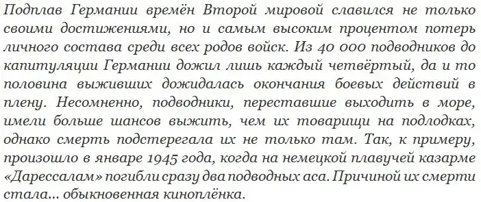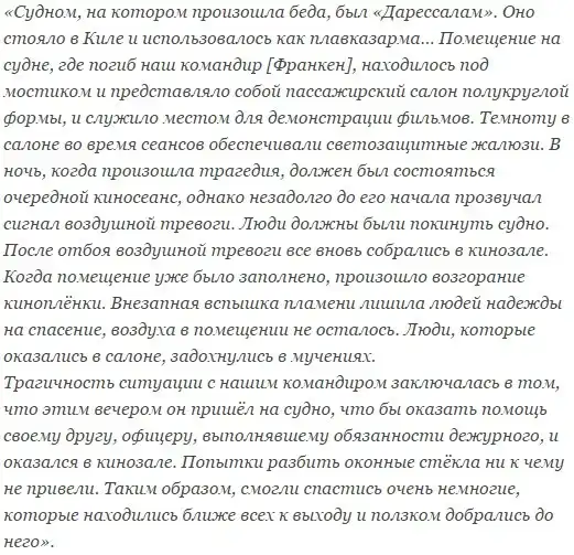 Неизвестно, были ли Франкен и Людден лично знакомы до того момента, как стали служить в штабе адмирала фон Фридебурга (Hans-Georg von Friedeburg), но вечер 13 января 1945 года связал их имена в истории воедино. В тот роковой для них день они находились на борту плавучей казармы «Дарессалам» (Daressalam) в Киле. Как гласят многие исторические работы, оба подводных аса погибли на этом судне во время пожара, без упоминаний каких-либо подробностей. Логично было бы предположить, что судно могло загореться во время очередной бомбёжки Киля, или что огонь возник по каким-либо бытовым причинам. Но ничего подобного на «Дарессаламе» в тот вечер не произошло, и как бы удивительно это ни прозвучало, причиной гибели людей стало кино или, если быть более точным, киноплёнка.