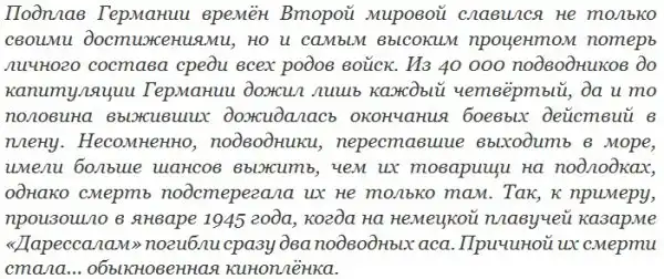 Согласно воспоминаниям радиста U 565 Гельмута Якша (Helmut Jacksch), 13 января 1945 года на борту плавказармы произошло нечто подобное: