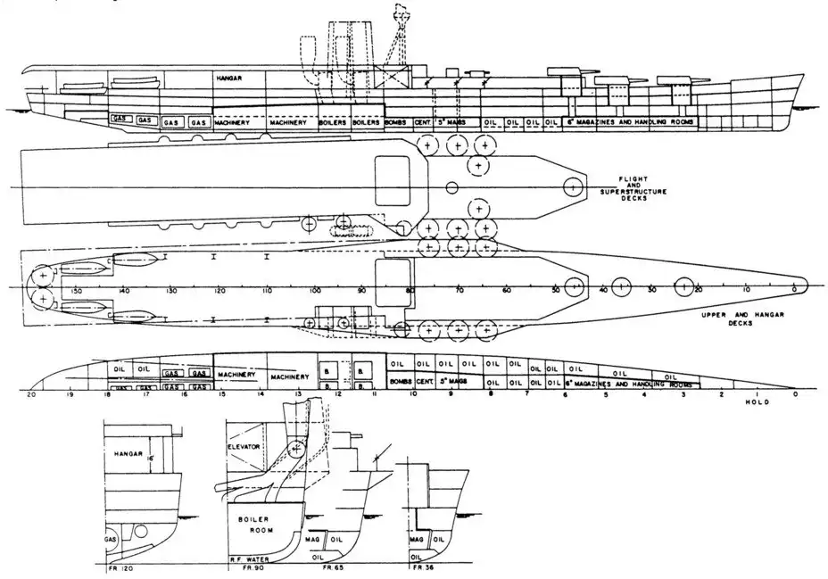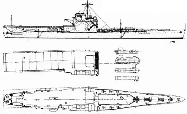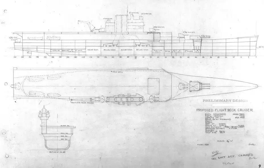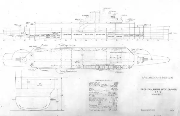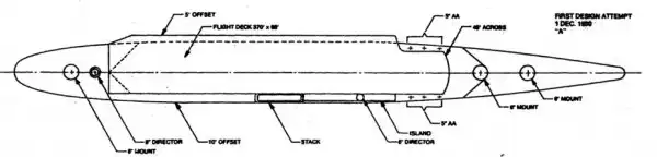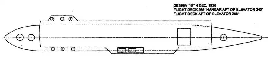 Наконец, 13 000-тонный авианосец предполагалось вооружить шестью 203-мм орудиями в двух башнях впереди и позади «острова». Корабль должен был иметь 89-мм пояс, 38-мм палубу и развивать скорость в 28 узлов.
